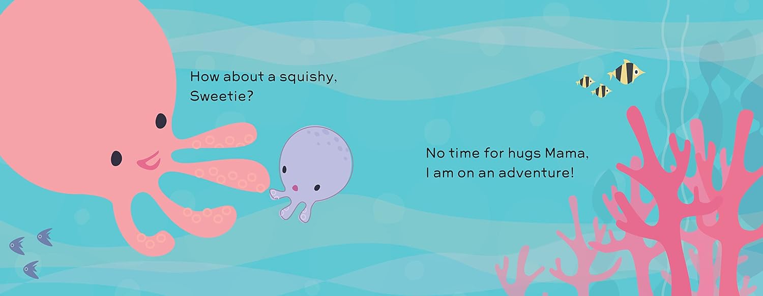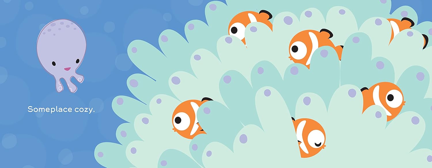 Leaving his warm and loving mama behind, Melville the sea creature sets off for an adventure, and he knows just the kind of place he’s looking for. Along the way, he gets lost (briefly), encounters sharks and other big sea creatures, and floats past a pirate ship. Melville checks out a few spots, but all fall short of his dream place…until, weary from his adventures, he finds his way back to his mama—a place that is “just right.”